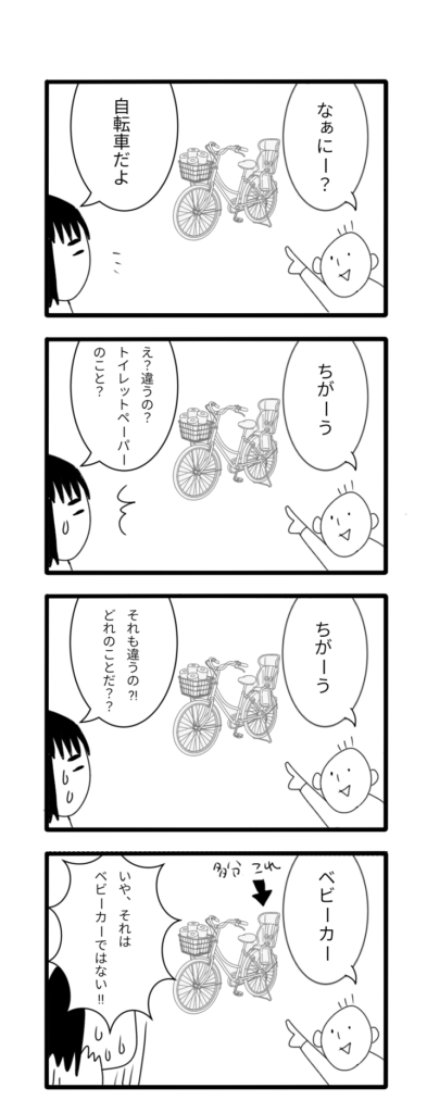 【育児4コマ】答えは既に知っている 4コマ漫画 X Facebook はてブ LINE コピー 2026.02.04 自転車はcopilotに描いてもらいました。 そういえば、これは、12月頃の出来事なので、時系列的には「はんぶんこ」の前の出来事です。