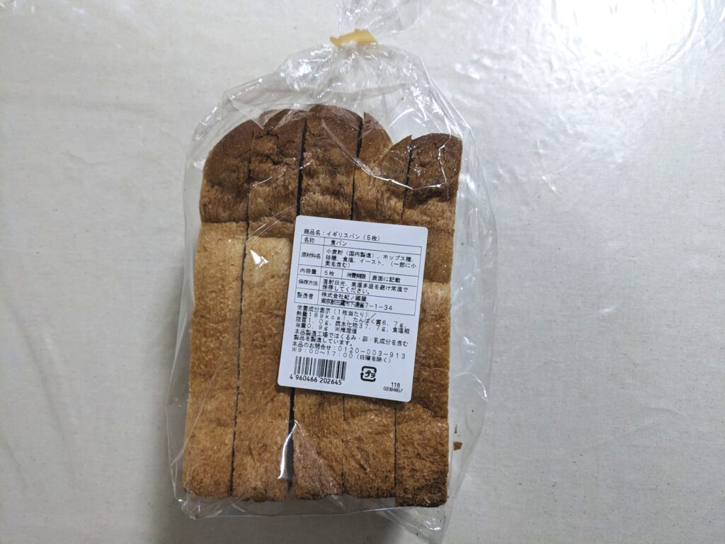 イギリスパンというだけあって、甘みが少なく、噛み応えがある食パンに思えました。(後から原材料名を見て、砂糖が入っていることに驚きましたが。それと、噛み応えがあったのは、5枚切りだったのが原因の可能性もある。いつもより厚みがあったので。)